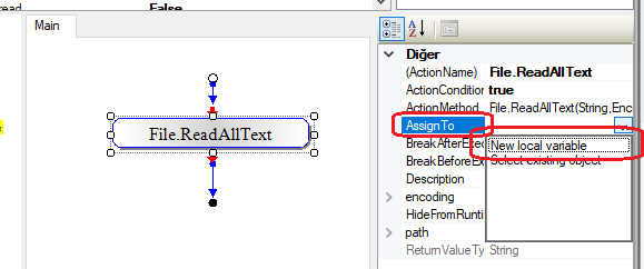 ReadAllText aksiyonumuzun "Assign to" adındaki özelliği dosyadan okunan yazının hangi değişkene saklanacağını belirler. Aksiyon sonucunu (yani dosyadan okunan içeriği) saklamak için yeni bir lokal değişken tanımlayalım.